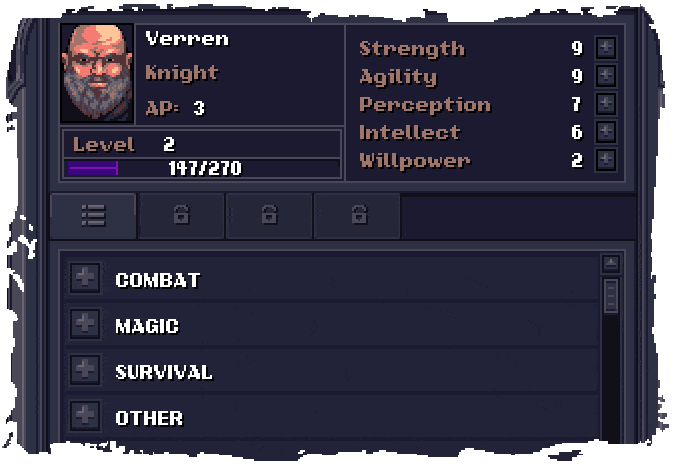 스톤샤드의 스킬 시스템은 여러분들을 캐릭터 구성에 있어서 한계를 짓게 하지 않습니다. 여러분은 양손 도끼를 휘두르는 전투 마법사나, 약을 쓸 줄 아는 은밀한 닌자가 될 수도 있습니다. 새로운 재주를 배우기 시작하기 위해 여러분이 해야 할 일은 그저 스킬 북을 찾거나 신뢰할 수 있는 스승을 찾는 것 뿐입니다. 기술 영역은 매우 난잡합니다: 창술과 궁술 마스터리, 기계학과 약학, 생존술과 연금술, 천문 마법과 비전 마법 — 그리고 그 이외에도 더 있습니다.