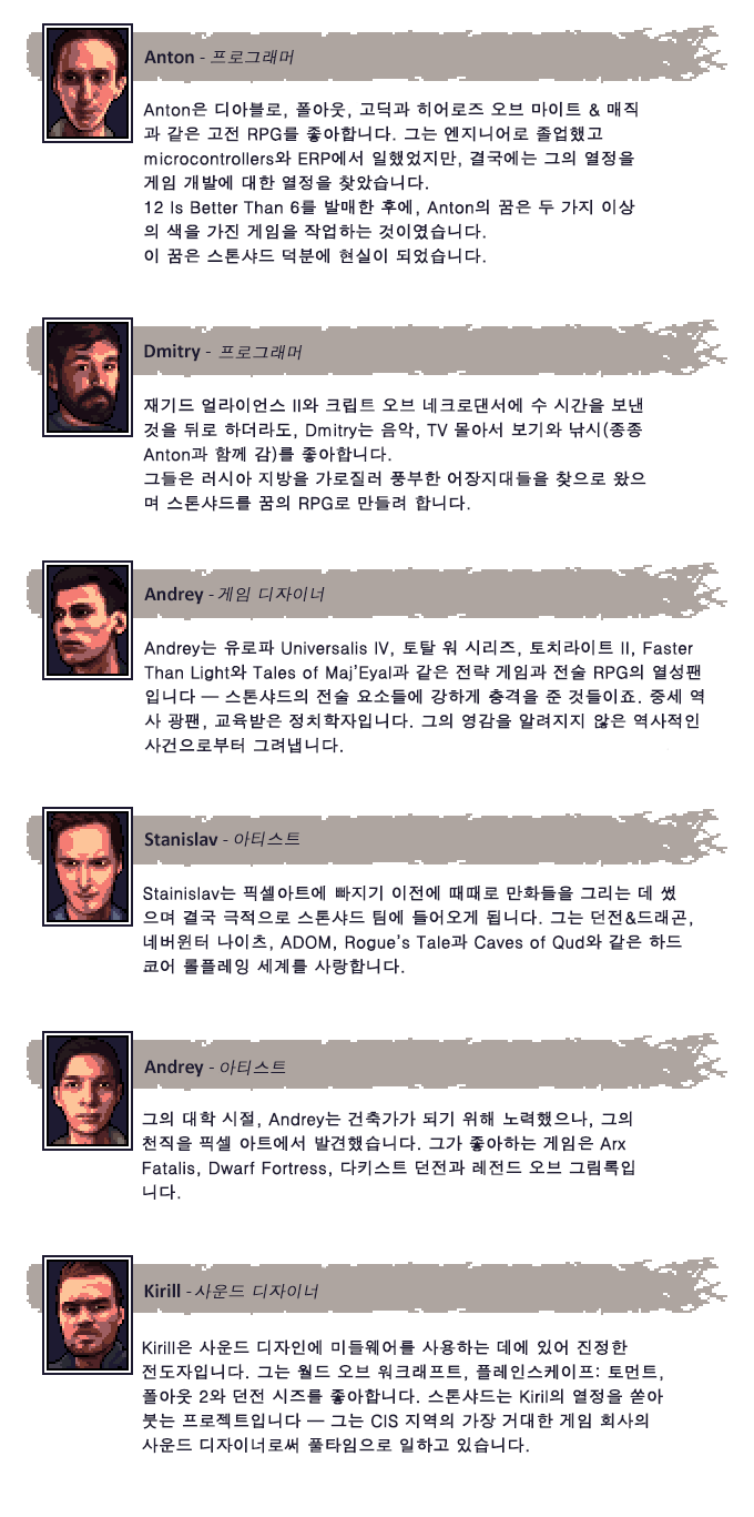 저희는 성공적으로 '12 Is Better Than 6'의 킥스타팅을 마치고 2015년에 발매했습니다. 게임은 성공적이였으며, 저희에게 스톤샤드의 작업을 시작하도록 도와주었습니다. 저희는 여러분들의 도움과 함께라면 저희가 스톤샤드를 가능한 한 멋지게 만들고 발매할 수 있을 것이라고 확신합니다.