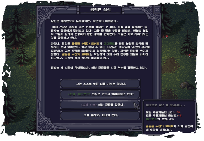 추종자들의 행동와 기분은 여러분의 전투 성공 — 또는 실패에 영향을 받을 것입니다. 여러분은 캐러밴의 태도에 주의를 기울여야 할 것입니다: 여러분의 추종자들의 기분을 띄워줄 것이 필요할 수도 있을 테니깐요.