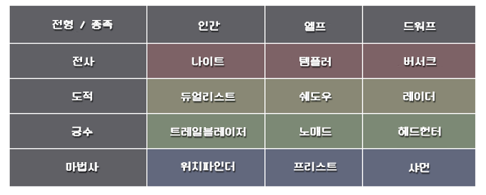 스톤샤드에서의 클래스들은 캐릭터의 전형 (전투 방식)과 종족의 결합으로 이루어집니다. 저희는 4가지 전형: 전사, 도적, 궁수 & 마법사와 12가지 클래스들을 소개할 계획입니다 — 각각 그들만의 스킬들과 능력들의 구성을 지니고 있습니다.