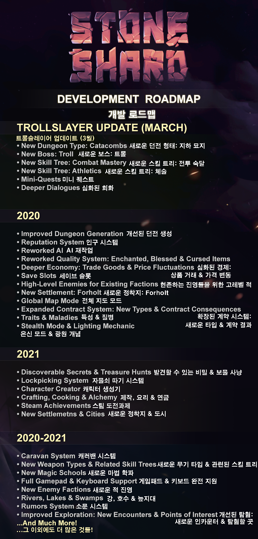 불행이도 저희가 계획했던 모든 것을 2월 6일까지 추가하지 못했기 때문에, 몇 가지 컨텐츠 (새로운 보스, 몇 가지 신규 스킬 트리, 확장된 회화 등)들은 3월에 발매될, 첫 번째 업데이트 – 트롤슬레이어와 함께 나올 것입니다. 이번 2월엔 대부분 보고된 버그와 밸런스를 맞추는 데 대부분 시간을 쏟을 것입니다.